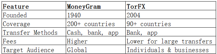 Differences: MoneyGram has wider global reach and physical agents but higher fees; TorFX focuses on online transfers and is better for larger sums.