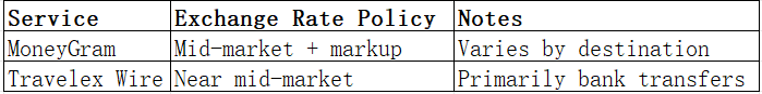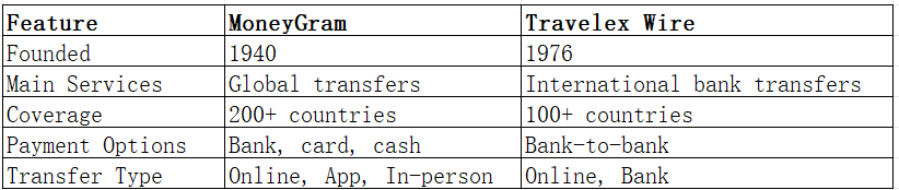 Differences: MoneyGram has broader global coverage and multiple payout methods, whereas Travelex Wire emphasizes secure bank transfers with competitive rates.