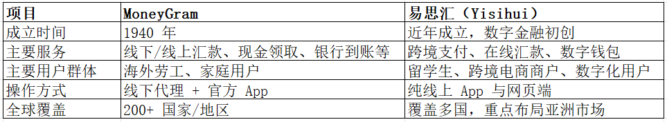 综合来看,MoneyGram 胜在历史悠久、线下网络广泛、品牌信任度高;而易思汇则在数字体验、费用透明度和亚洲市场定位上更具优势。