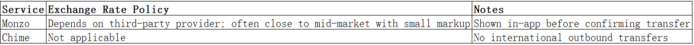 Exchange rates significantly impact the total transfer cost. Because Monzo uses partner services, the exchange rate depends entirely on the selected third-party provider. Chime does not offer international transfers, so no exchange rate applies.