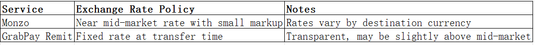 Monzo offers dynamic rates aligned with market fluctuations, while GrabPay Remit provides fixed rates for consistency. PandaRemit also offers competitive rates close to the mid-market.