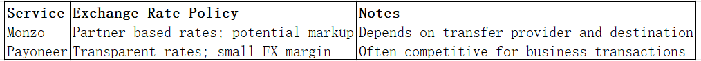 Monzo: Full digital banking app; Payoneer: Payment platform for business/freelance users