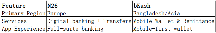 N26 targets European users; bKash primarily serves South Asian mobile users.