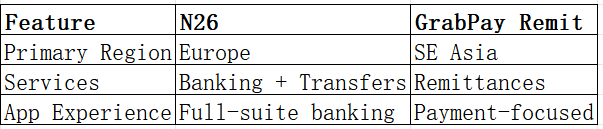 N26 is a European digital bank; GrabPay Remit is a Southeast Asian remittance provider.