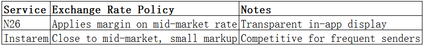 Both N26 and Instarem apply a margin on mid-market exchange rates, visible in-app for transparency. Instarem typically offers more competitive rates for certain corridors. PandaRemit also provides favorable rates for multiple currencies.