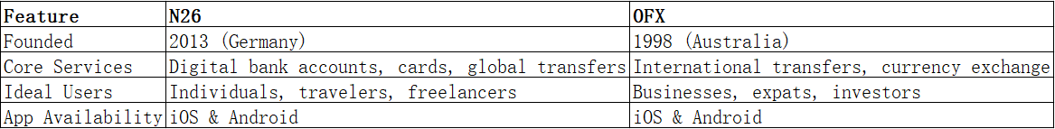 In summary, N26 vs OFX represents two distinct approaches to global money management. N26 appeals to everyday users and travelers seeking a seamless digital bank experience. OFX, on the other hand, suits users managing higher-value international transfers who appreciate competitive rates and personalized support.