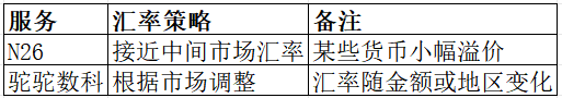 汇率对跨境汇款成本影响显著。N26接近中间市场汇率,但部分货币有小幅溢价;驼驼数科汇率根据地区和金额调整。