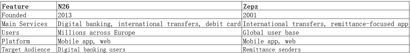 Differences: N26 focuses on comprehensive digital banking solutions, while Zepz specializes in remittance services. Fees, transfer speed, and coverage vary between the two.