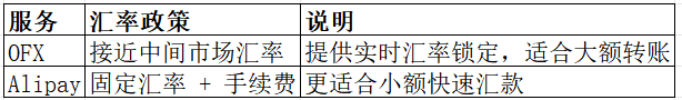 差异点: OFX 的费用结构更适合大额汇款,Alipay 更便捷,适合小额快速转账。