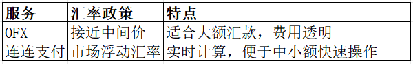 汇率是跨境汇款成本的重要组成部分。OFX接近中间价,适合大额汇款;连连支付汇率略高于市场价,适合快速中小额汇款。