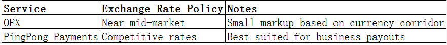 Both OFX and PingPong Payments offer rates near mid-market, with minor markups. The table above shows a comparison with Panda Remit’s competitive rates.