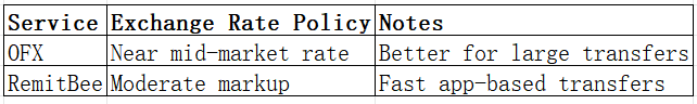 Exchange rate markups can significantly affect transfer costs. OFX usually offers rates close to the mid-market rate, favorable for larger transactions. RemitBee may apply higher markups for the sake of simplicity and speed.