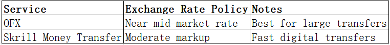 Exchange rate markups affect the total cost of transfers. OFX offers rates close to the mid-market rate, which is advantageous for large transfers. Skrill Money Transfer provides competitive rates with slightly higher markups for convenience.