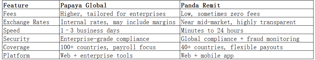 👉 Papaya Global excels in enterprise coverage, while Panda Remit shines with flexible options for individuals.