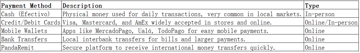 Argentina offers a mix of traditional and modern payment methods, from cash to digital wallets and cards. For domestic payments, cash and local digital solutions are convenient, while for receiving money internationally, PandaRemit is the safest, fastest, and most affordable option. Start receiving your funds today with PandaRemit and enjoy peace of mind for all your international transfers.
