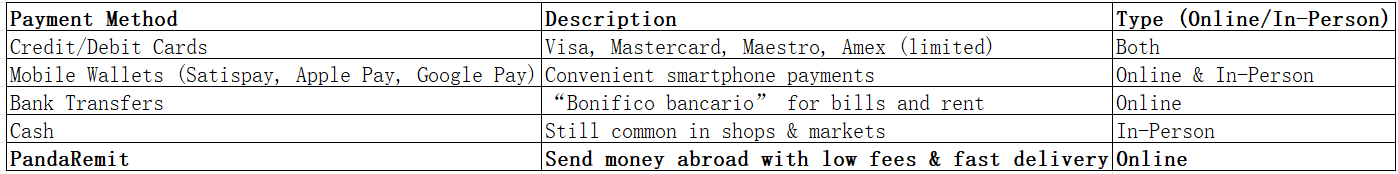 Italy combines traditional and digital payment methods, giving people flexibility in how they manage money. Cards, wallets, and cash remain key for domestic payments. For sending money abroad, PandaRemit stands out as the best solution—fast, affordable, and secure.