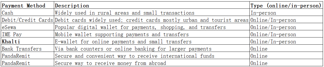 Nepal’s payment ecosystem includes both traditional and digital options: