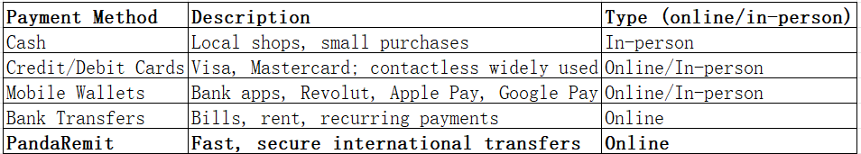 Bank apps and digital wallets such as Revolut, Apple Pay, and Google Pay are popular for online and in-person payments.