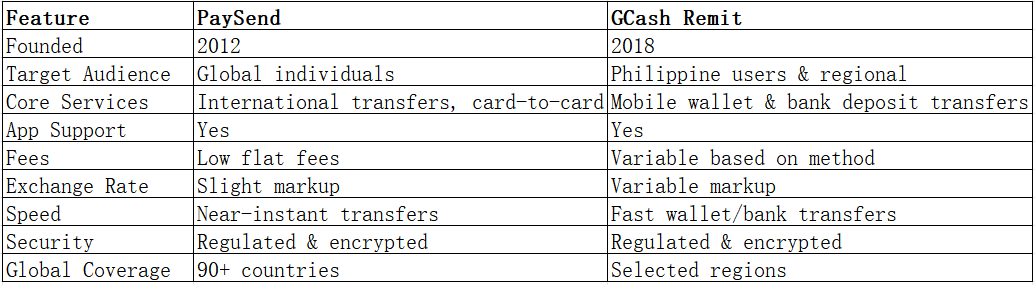 Fee structures differ, with PaySend using flat fees and GCash Remit offering fees based on transfer method and amount