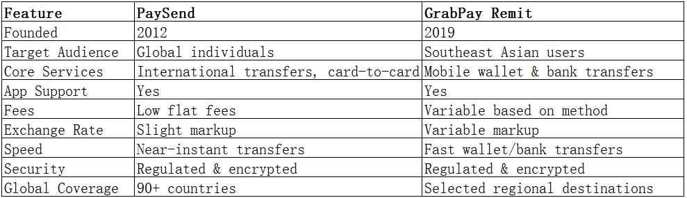 Comparing PaySend vs GrabPay Remit shows PaySend excels in fast, affordable personal transfers worldwide, while GrabPay Remit is tailored to Southeast Asian users and regional payments.