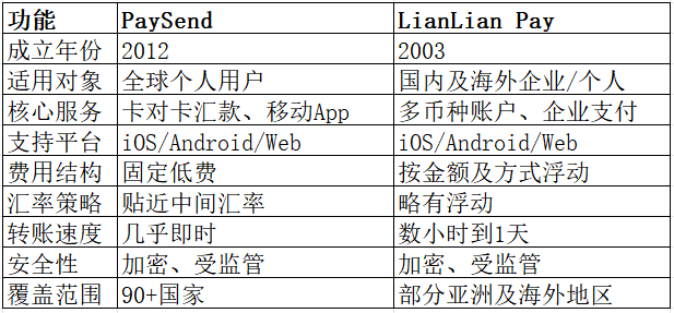 通过对比PaySend vs LianLian Pay,可见PaySend在全球个人汇款中速度快、费用低,而LianLian Pay适合企业及多币种用户。