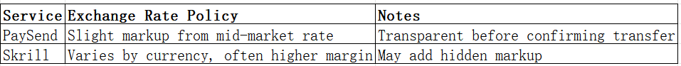 Exchange rate margins directly affect the amount your recipient receives. PaySend typically applies a small markup on the mid-market rate, while Skrill may add a larger margin (sometimes up to 3.99%).