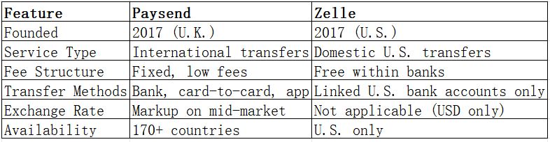 Both services emphasize simplicity and digital convenience, but their target markets differ significantly — Paysend for global users, and Zelle for U.S. domestic transfers.