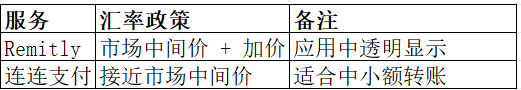 费用: Remitly按汇款速度和金额分层收费;连连支付费用相对固定,适合中小额转账。