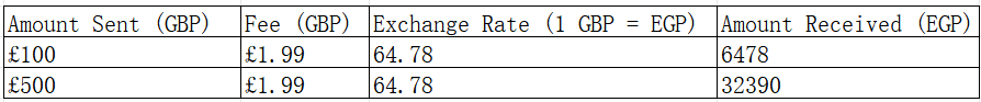 Example Transfer Table (based on 1 GBP = 64.78 EGP):