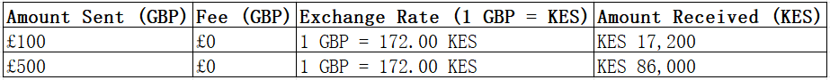 Remitly charges no fee for sending money to Kenya, with an approximate exchange rate of 1 GBP = 172.00 KES.