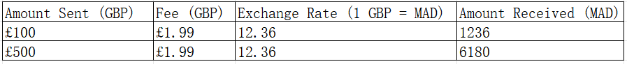 Example Transfer Table (based on 1 GBP = 12.36 MAD):