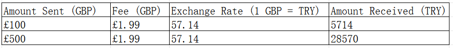 Example Transfer Table (based on 1 GBP = 57.14 TRY):