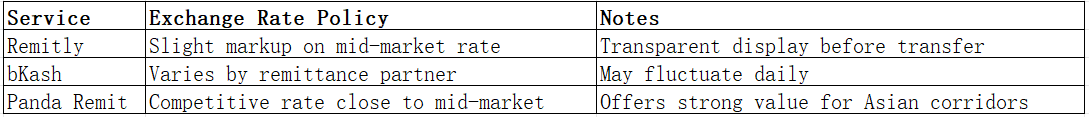 Exchange rates can greatly affect the total amount received by recipients. Remitly applies a small markup over mid-market rates, which is displayed transparently before confirming a transfer. bKash, on the other hand, relies on its partner networks, which may result in fluctuating rates depending on the remittance corridor.