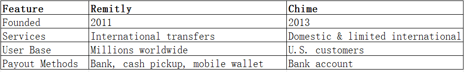 Payout Options: Remitly supports cash pickup and mobile wallets; Chime is bank-centric.