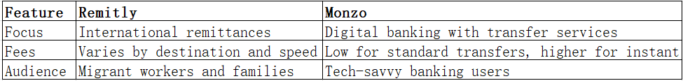 In the Remitly vs Monzo comparison, both services have unique advantages. Remitly excels in international remittances with flexible delivery options, while Monzo provides a full-featured digital banking experience with convenient transfer services.