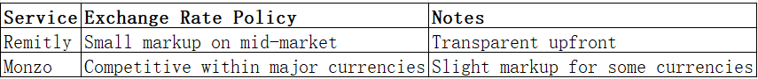 Remitly applies small markups on the mid-market rate. Monzo offers competitive rates for standard currencies but may add markups for exotic or non-Euro currencies.