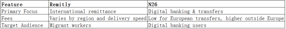Remitly excels for users sending money abroad, providing flexible delivery and competitive fees. N26 is ideal for users who want a multifunctional digital bank with international transfer options. For users seeking low-cost, fast, and secure transfers, Panda Remit is a valuable alternative.