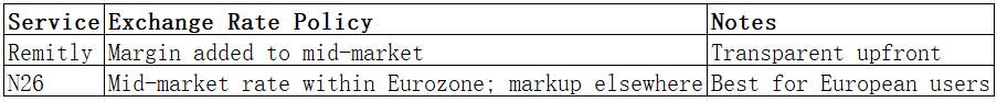 Exchange rate margins differ between the two. Remitly typically applies a small markup on the mid-market rate, while N26 offers competitive rates within Europe but may add markups for non-Euro transfers.