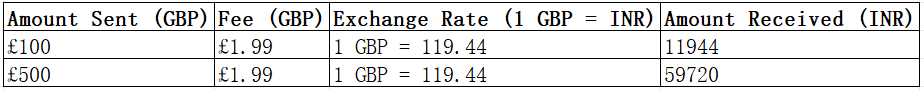 Below is an example transfer table for sending money from the UK to India through Remitly: