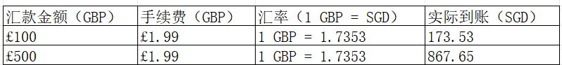 Remitly 的收费结构由固定手续费 + 汇率加价组成,同时不同的汇款金额可能影响手续费与可用汇率。以下是一个示例表格(按 2025 年 10 月参考数据,1 GBP ≈ 1.7353 SGD):