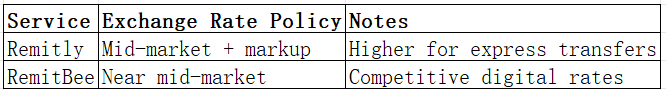 Exchange rates also impact transfer costs. Remitly may include a markup over the mid-market rate, especially for express transfers. RemitBee offers competitive rates, often closer to the mid-market, which helps reduce hidden costs.