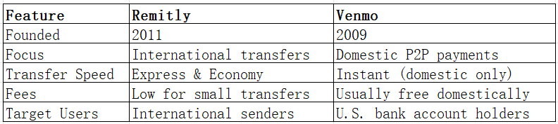 Differences: Remitly focuses on international transfers with varying speed and fees, while Venmo is designed for domestic payments only.
