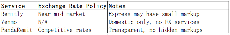 Remitly provides exchange rates near the mid-market rate, with express transfers sometimes having a small markup. Venmo does not provide foreign exchange services.