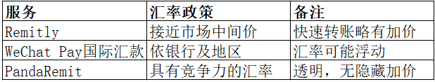 Remitly的汇率接近市场中间价,快速转账可能略有加价。WeChat Pay国际汇款提供的汇率受目的地及银行合作影响。