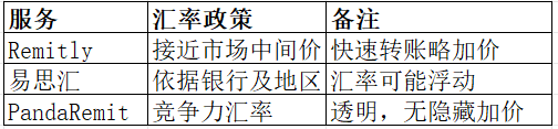 Remitly接近市场中间价,快速转账略有加价。易思汇汇率受目的地及银行影响可能浮动。