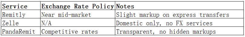 Remitly provides exchange rates close to the mid-market rate, though express transfers may have slightly lower rates. Zelle does not offer foreign exchange services as it is limited to domestic transactions.