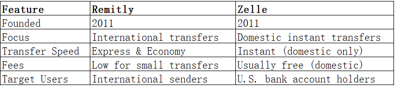 Differences: Remitly targets international remittances with different speed options, while Zelle is primarily domestic with instant transfers and limited international reach.