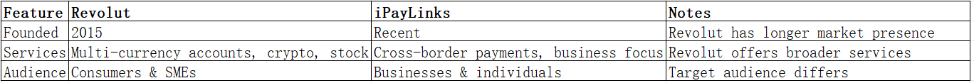 Target Audience: Revolut serves both consumers and SMEs, while iPayLinks focuses more on business clients.