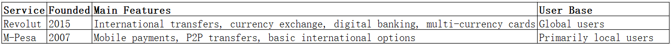 Revolut targets global fintech users, while M-Pesa primarily serves mobile payments in its main regions
