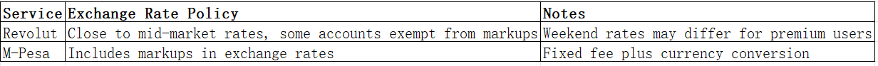 Revolut fees vary depending on account type; standard users may incur small fees or exchange rate markups, while premium users enjoy lower or no fees. M-Pesa international transfers involve fixed fees plus currency conversion costs. Fee reference